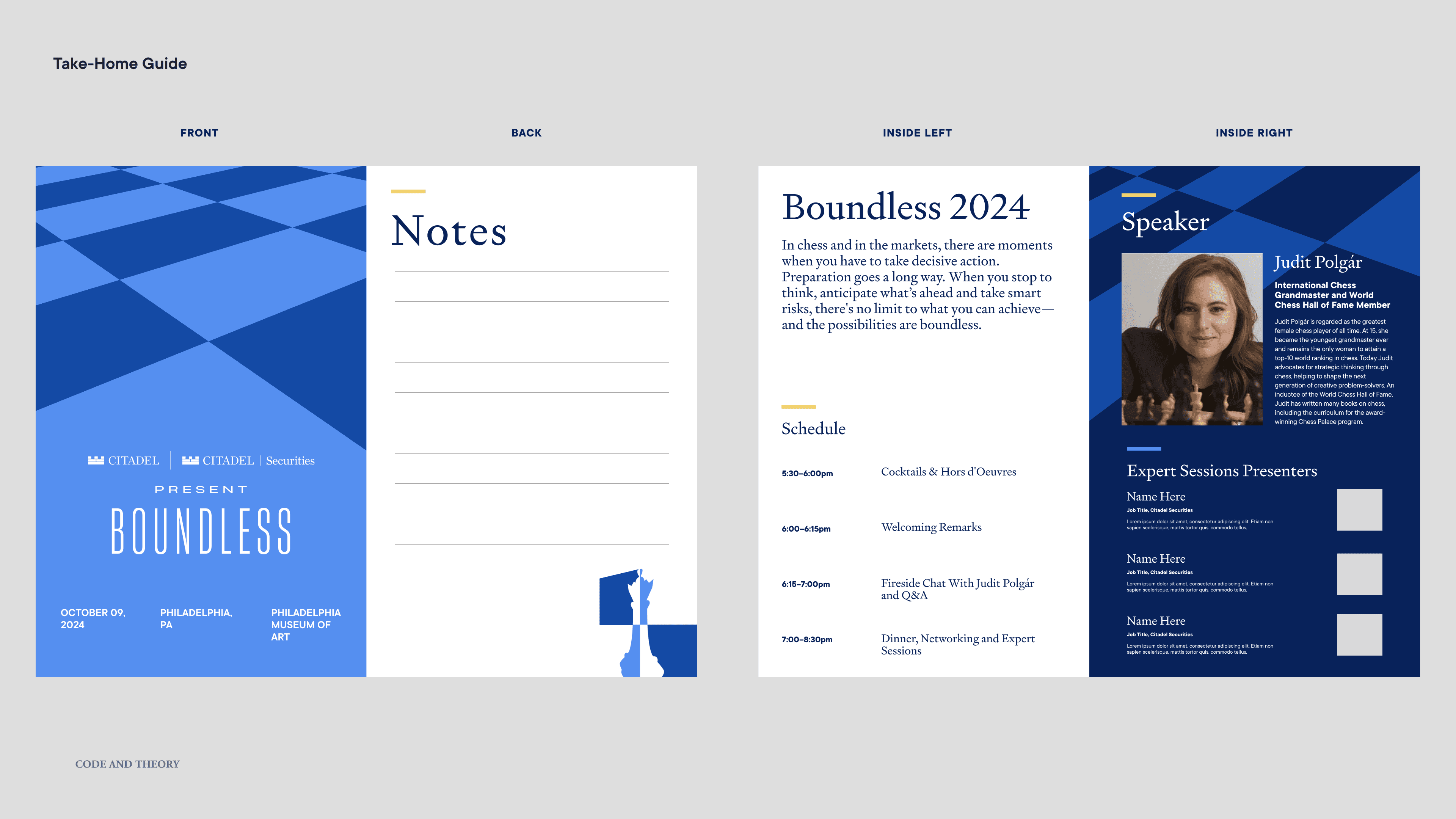To create a seamless brand presence at the event, Citadel required a suite of print and digital assets to support registration, engagement, and networking opportunities. The challenge was to ensure all materials reflected Citadel’s brand identity, while also fostering a welcoming and professional environment for attendees.